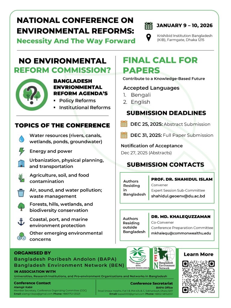 We are pleased to announce that Bangladesh Poribesh Andolon (BAPA) and Bangladesh Environment Network (BEN) will be organizing the ‘National Conference on Environmental Reforms: Necessity and Way Forward’ on January 9-10, 2026, at the Krishibid Institution Bangladesh, Farmgate, Dhaka.